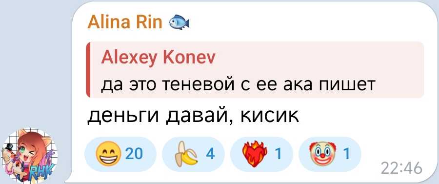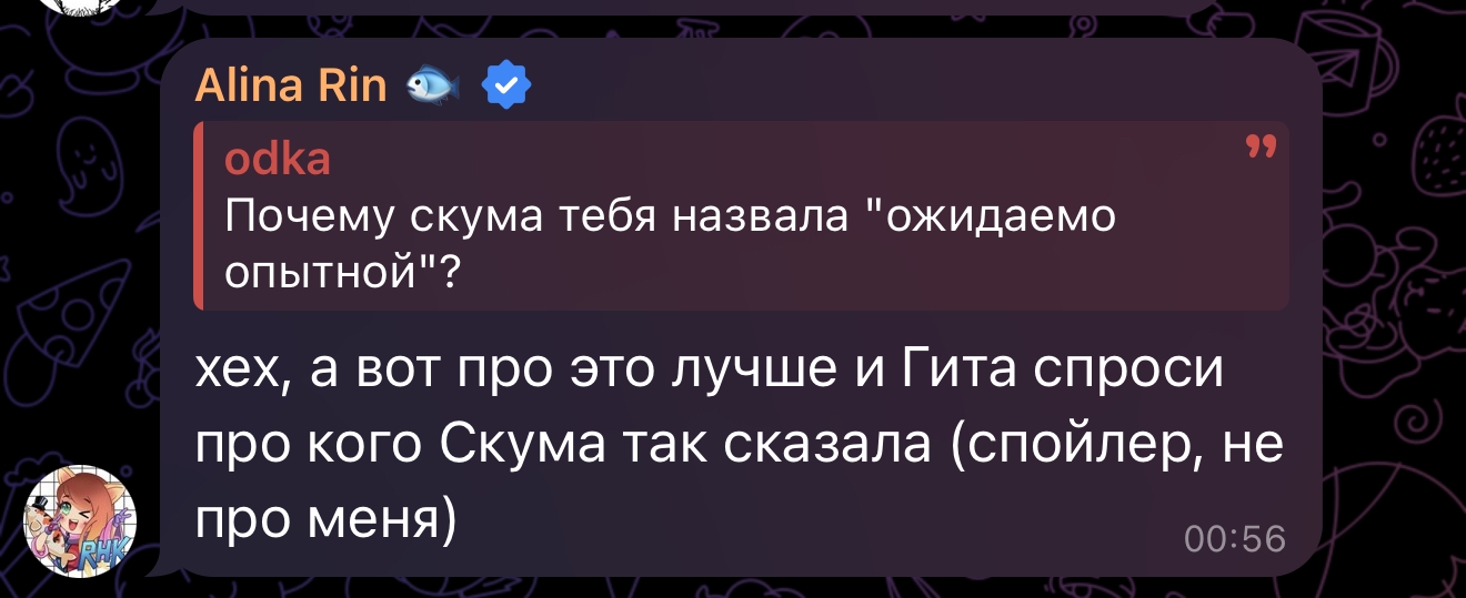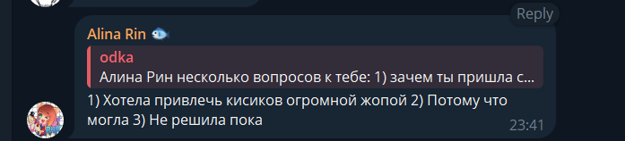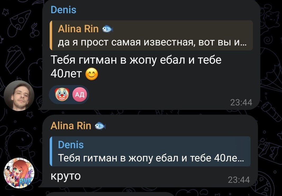 Если коротко, она сначала иронично отвечала про Гитмана, как бы при этом не отнекиваясь что мутила с ним. Но потом ее спросили, почему скума кэт в той слитой переписке сказала что ты ожидаемо опытная, Алиночка нахуя то решила отпиздеться, что это не про нее, а про другую бабу. Хуета какая то. Ты как бы если решаешь больше не притворяться, то делай этотполностью, а не "с Гитом еблась, но скума писала ее про меня".