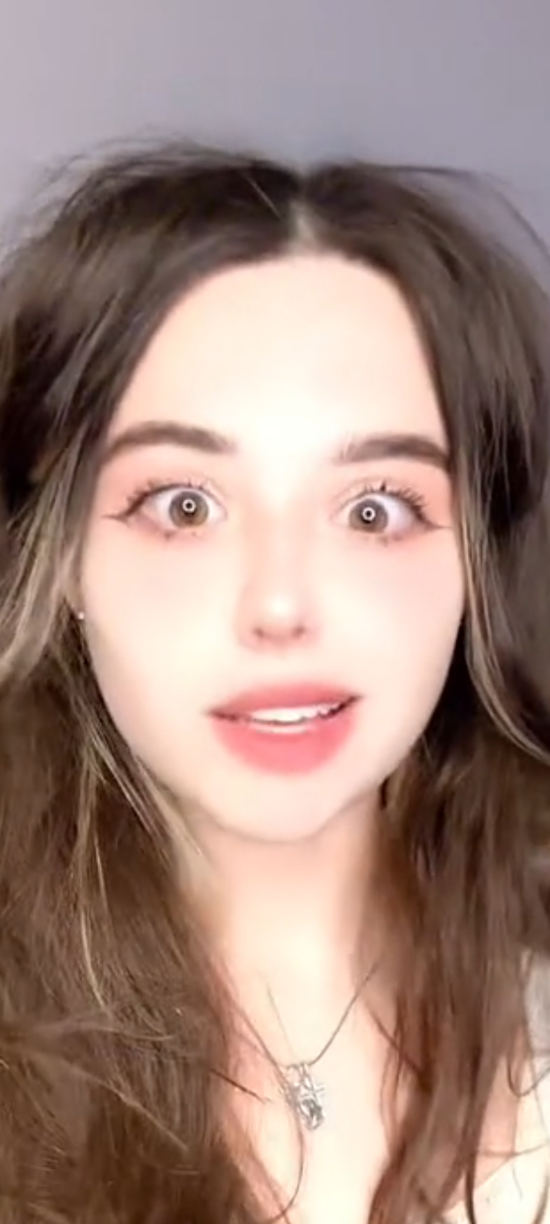 ### Почему так видно: - Ткань белой кофточки с чёрным горошком довольно тонкая и мягкая (типа хлопкового трикотажа или пижамного топа). - В кадрах, где она двигается (особенно когда наклоняется, поворачивается, кладёт руку на грудь или машет рукой), хорошо заметна естественная форма и движение груди — без жёсткой поддержки, чашек или линий от бретелек/косточек. - Когда рука лежит на груди (кадры 4–6, 12, 15), ткань облегает свободно, без характерного «подъёма» или контуров бюстгальтера. - При ярком свете и движении иногда просвечивает лёгкий контур сосков (типичная картина для тонкой белой одежды без лифчика).
