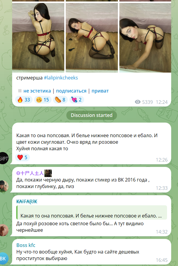 уже 100 пережёвано что у неё основной доход - торговля кинковым контентом в телеге или ещё где в приватках. по факту это проституция или как минимум изготовление порнографических материалов (статья УК и для того и для того имеется), но формально доказать невозможно. поэтому "стримерша" да