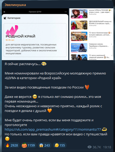 Вот получи ты хоть ещё миллиард корок, стань властителем всех жалких человеческих судеб, но ты всё равно без любви к людям останешься бескультурной пидорахой. Понимаешь? Не понимаешь вероятно. А Ева клёвая как Салтыкова, правда. Больше десяти лет уже прошло , а она, пройдя долгий путь, сильно поменявшись, всё равно таки поступила, как и обещала, снимает классные видео о поездках по разным уголкам России. И никто тут не рассказывает, что у неё нет недостатков. Их множество, но жизнь такая тут в этой вселенной, на этой планете, в этой стране такая. Только Эвелина все равно сумела остаться человеком. Не только в биологическом плане. Особенно в наши дни. И ей за это можно сказать спасибо.
