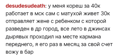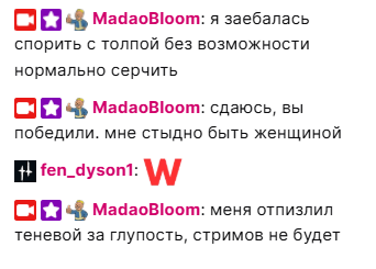 >>26071306 смотрела кейпоп, зашла в новости, под руку попалась новость об алиментах, начала истерить что мужчины не платят алименты и не хотят забирать детей, всех под один уровень поставила, в чате ее поправили, привели примеры, она поняла что еще играть в ведьмака и ее никто не поддерживает за истерила и выключила стрим, после стрима плакала, зашла в тред, увидела обсуждение и удалила запись