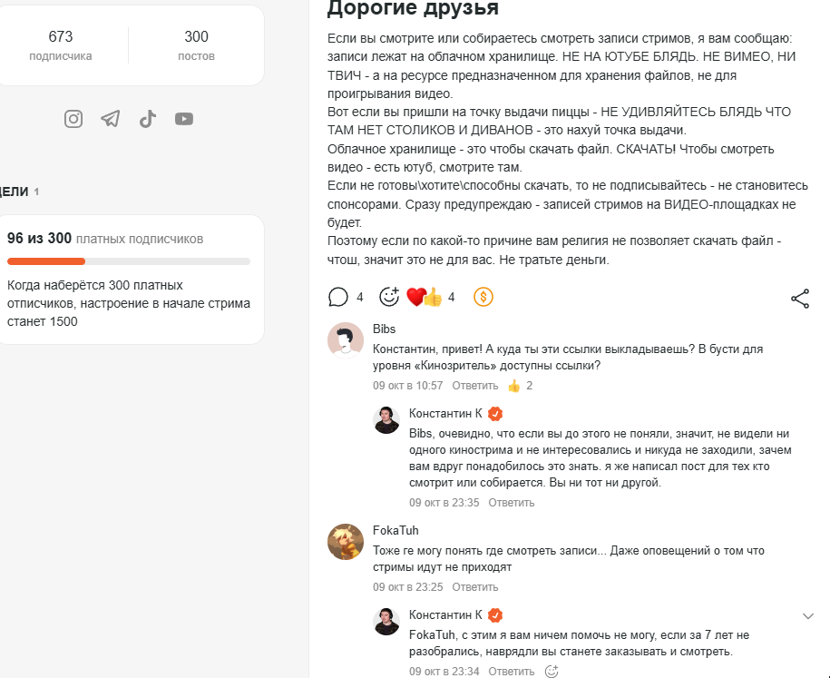 >>25364588 Я так понял из поста на бусти и комментов, что он про киностримы и их записи высрался. Разговорные якобы никуда не делись, хуй пойми блять. Реально только людей запутал мудак ебаный. Может разговорные последние были не удачные и он скрыл. Инфы нигде нет, его спрашивают про это, а он про киностримы сидите разъясняет. В пизду короч