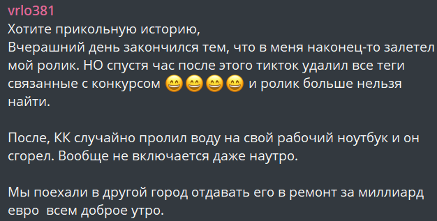 Кстати говоря ребят, у кого память получше может вспомнит про то, что ноут сломается "были знаки"! Где-то пол года назад, может чуть больше, жиробубель сидел и ныл на стриме про очередную свою "псевдонеудачу" по жизни и такой как спизданет: - "ну вот что может ещё со мной случить? Ноутбук рабочий сломается?" Я тогда ещё понял, что это как "чеховское ружьё" выстрелит как нибудь обязательно)