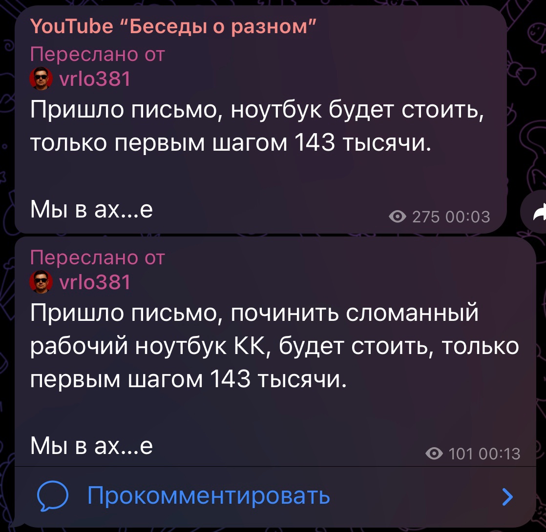 Дорогие подписчики сказали, что ноутбук будет дешевле починить в России. Мы с Пётр Борисовичем посоветовались и приняли непростое решение. Мы возвращаемся в Россию. В России нас ждёт уголовное преследование, поэтому нам нужен адвокат. Адвокат будет стоить 5 миллионов рублей. Это начальная стоимость услуг. Мы в ахуе. Зайдите на стрим, поддержите Петра Барисыча