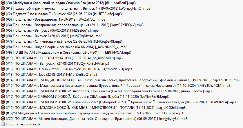 Запарился и выкачал все записи по шпалам начиная от 2012 и до наших дней,. Внутри все отсортировано по хронологии с подписью дат. Кто хочет себе бубнеж двух алкашей перед сном, качайте