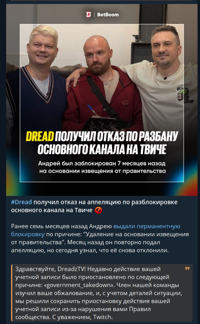 >🤔В общем, когда полномочия и ответственность разбана не только на твиче, то они вероятнее всего на общих основаниях направляют запрос с согласованием тем, кто потребовал блокировки, из за чего время рассмотрения апелляции увеличивается, к примеру в случае с РКН, он отвечает в течении 30 календарных дней, обычно в период 25-30 дня с момента запроса. В связи с чем, и без того неустановленные твичем сроки рассмотрения, минимально сдвигаются на эти 30 календарных дней.