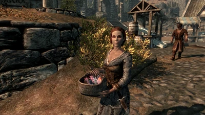 начинает играет суперумиротворяющая музыка, спукаешься с горы, пиздишь пару волков, потом доходишь до первой деревни, там бегает курица, какая то старая бабка орёт, что видела дракона, её сын называет полоумной, стоит рядом кузнец чё то отбивает на наковальне, речка журчит, птички поют кайф короче
