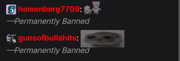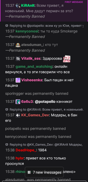Пока он банит людей эти скрины растаскивают по чатам и скидывают другим стримерам, а шизя ещё находится в каком-то инфополе. Надо организовать ему полное забвение со стримами для спящих бизнесменов как он хочет и прекратить следить за ним. Возможно баны это наоборот теперь такой перфоманс такой чтобы привлекать к себе внимание.