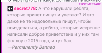 Я написал "Всем привет" с аккаунта на котором не было фолоу ни на Мэда, ни на его подсосов и всё-равно пермач дали. Хуй поймешь их логику, как-будто просто на рандоме ебашут.