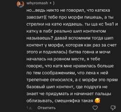>>25399228 в чем он наебщик? кого он наебал сука >>25399230 >Для тебе не странно что он хочет просто со всеми девушками дружить? он дружит со всеми, что-то ты пропускаешь момент что он так же пишет скаю, писал ктому когда он играл > Вот даже пример, почему он Даше пишет и зовёт играть когда она дома и Ваня может просто крикнуть или спросить сам? а какая разница кто зовет, ваня то явно не будет против, в чем проблема? > Почему он зовёт Юлю, Лизу когда это может сделать Даша которая с ними больше общается и знает что они делают в этот момент мб? какая нахуй разница кто и кого зовет? это шутка какая-то? >Вот допустим Скаю похуй он никому не пишет откуда ты знаешь? может он так же пишет рыжему, мевсу, овле мб писал, просто он из за своей зажатости может им не очень может писать, ты судя по всему такой же поэтому для тебя мевсу делает что-то аномальное >Он же по факту рискует себе карьеру или просто возможность стримить на больше онлайна. вот только он изначально испортил себе режим из за того что они играли в 3 без гайки, овлы, лизы, что плохого в том что ему нравится общаться с друзьями, заводить новые знакомства, он по сути вылез из ниоткуда и попал в большую компанию и не хочет её проебать в будущем, если он не будет с ними пытаться контачить вне стрима то рано или поздно на него забьют хуй и будет просто сидеть ммчик регать как трайд например и всё