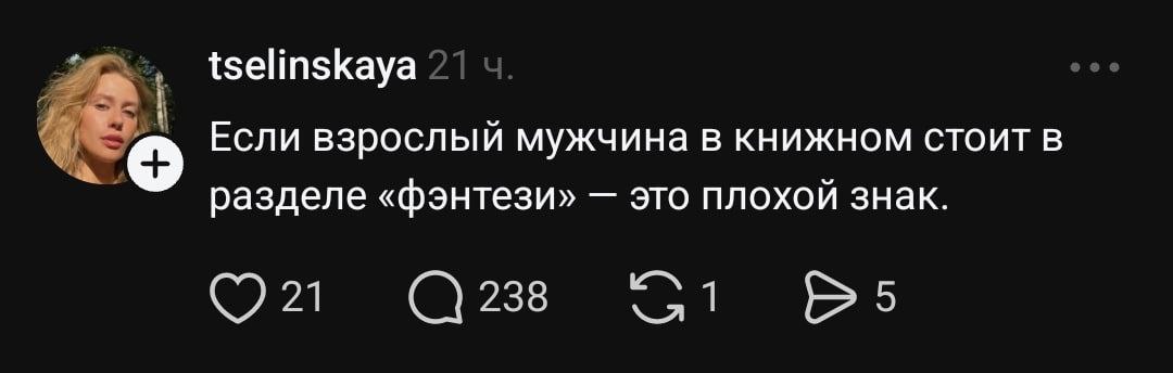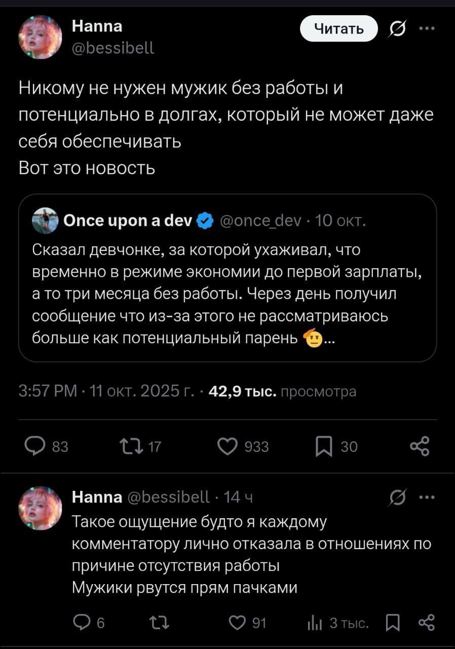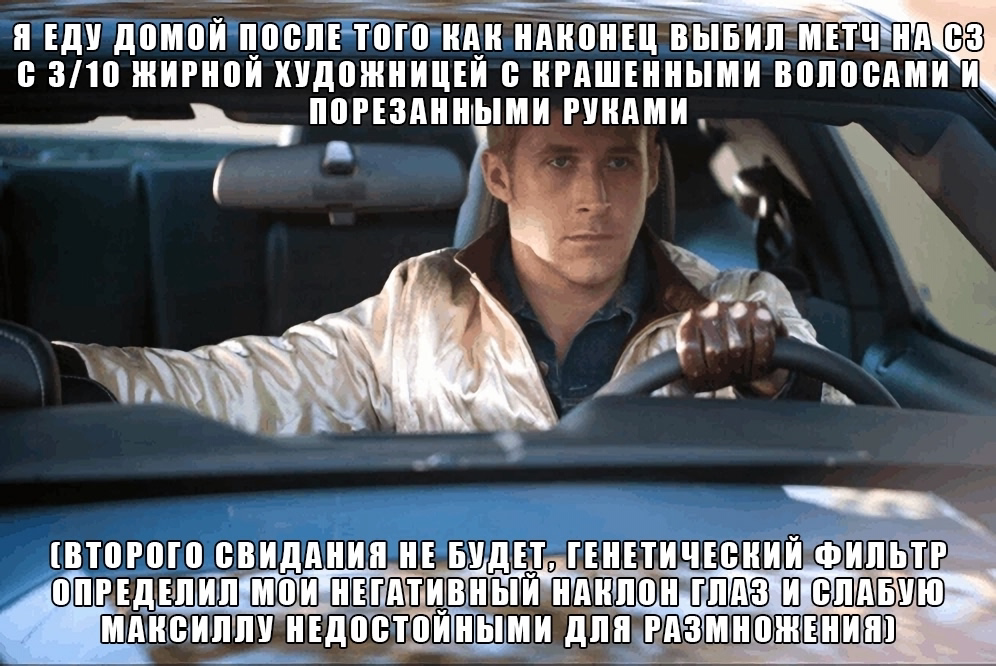 Я щас вспоминал и не смог вспомнить ни одного случая заигрывания с девушками, где все не окончивалось рассказом девки о том как она кого-то любит нормального, а не меня ублюдка. Ну то есть кейсы где флиртуем гуляем. И никогда девка просто не могла сказать что я вот ей дескать не подхожу, поэтому всё пока. Обязательно должна была унизить и втоптать в землю, рассказывая как она в кого-то влюблена, просто сейчас не может с ним быть вместе. Но скоро будет. Как-то так. Прям удивительно. Обязательный ритуал унижения и обесчеловечивания.
