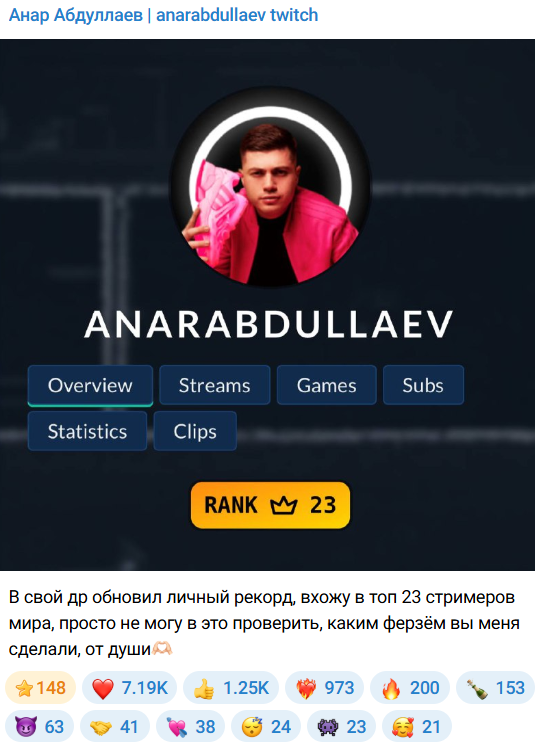 1. Слей кинг - Анар. Думаю объяснять не надо. Чел ебет твич, 0 рекламы на твиче, стримы с продакшеном на свои бабки, если афк стримы то топ завозы с сквозняком. 2. Слей квин - Генсуха. Король выбрал королеву. Онлайн на соло стримах без Анара уже по 4-5к. Она реально зашла людям 3. Мем года - Стил. Смешно каверкает слова, завозной чел, сэму руль 4. Шип года - Анар и Генсуха. Много контента вместе, аудитория их нереально шиперит. 5. Пара года - Анар и Генсуха. Либо Равш и Сабина (если заанонсят на публику отношения). 6. Стример категории общения - Анар. У него по сути все стримы в категории общения, все его шоу кто я контейнерi etc. 7. Артист года - Майот. Тут даже не надо чет писать, у чела дудь интервью брал если что. 8. Прорыв года - Анар. От ноунейм чела до стабильных топов и всегда в топ тусовках. Еще даже год не прошел. 9. Кс стример года - Мага. По кд стабильный высокий онлайн, стримит только и только КС. Посмотрите стату сами. 10. Киберспортивный комментатор - Пчелкин. Чел комментит все что дают, и очень круто. У него охуенный опыт в компететiв кс и хорошие комментаторские навыки. У других обычно что-то одно из этого. 11. Стример доты года - Равшан. Даже объяснять не буду. 12. Проект года - день рождения Анара. Лучшее сто было за всю историю снг твича. 13. Сквад года - стая. На остальные категории похуй. Это самые важные