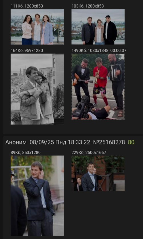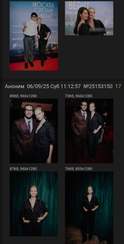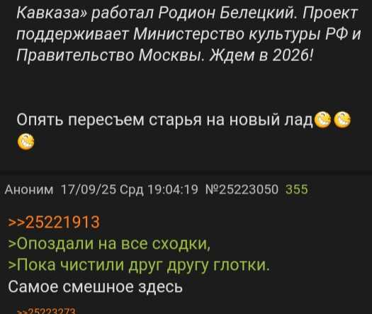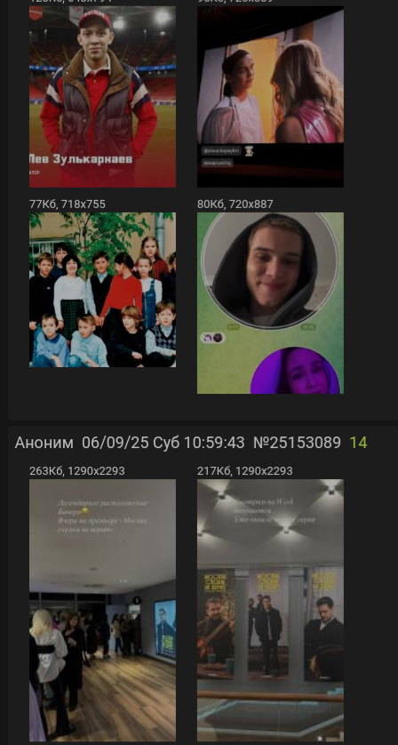 Аноним 27/09/25 Суб 14:36:18 № 25284856 151 >>25283547 Ну тащемта я пишу что думаю, захотел - стихи, захотел - рисунок, зажотел - максимова и пересельдь хуями накрыл. Так-то я после срача с камчаточником тут не очень стал сидеть. >>25290140 Аноним 27/09/25 Суб 14:37:10 № 25284859 152 >>25284042 Кстати прям щас терминатор 2 смотрю! Аноним 27/09/25 Суб 15:25:12 № 25285182 153 >>25277875 >>25275853 Да это скорее всего театр перед Мизулиной которая тоже была на премьере этого фильма,про еблю с водителем Мишей уже месяц назад вбрасывали и все только поржали с этого.