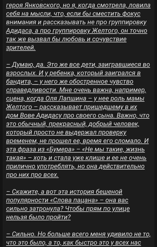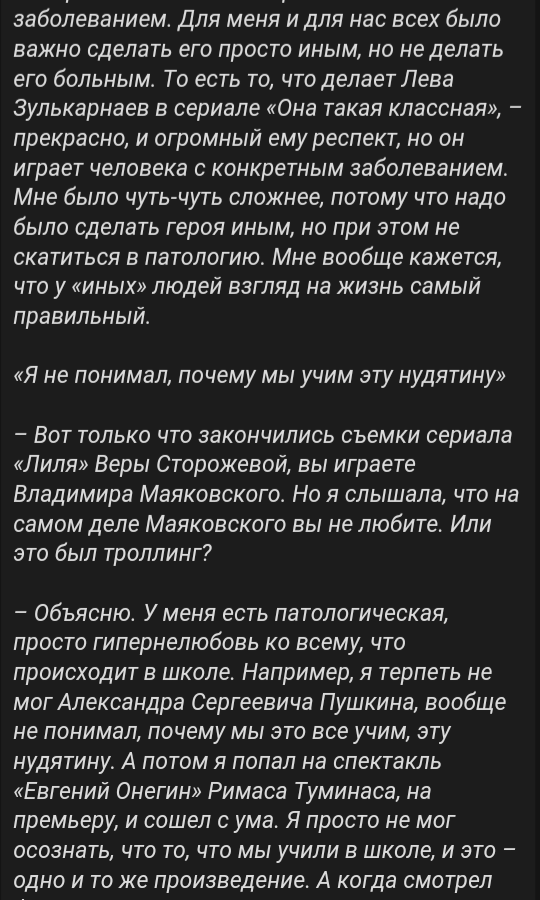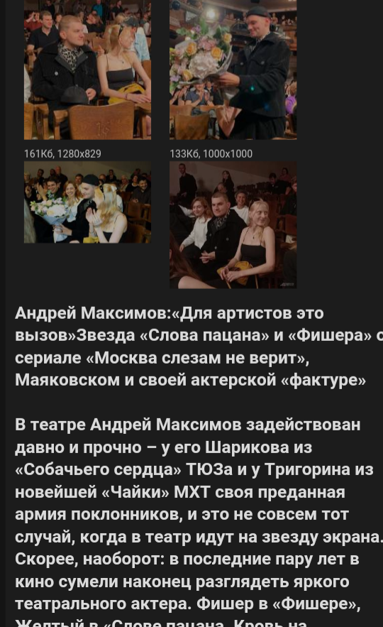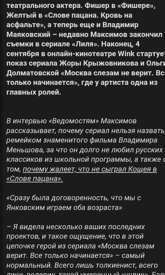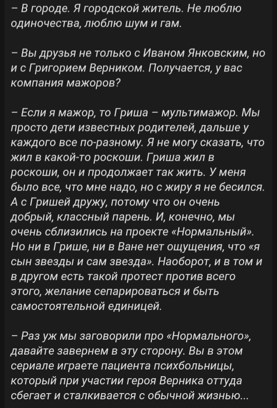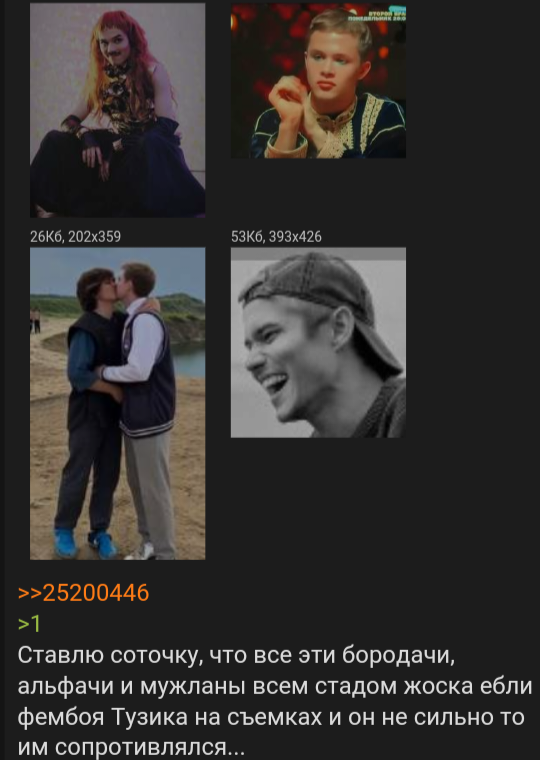 >>25465460 Нет никакой великой любви между Янкой и Максимовым,максимум Янык его пехнул а тот может забыть не может хотя тот и за Верником похоже бегал.У Яныка там то Тихон,то Евдокимов,баба из Москва слезам не верит, Кристина Анус и ещё кто-то и если бы Дианка не залетела то он бы и её нахуй послал."Ой вот там Янка отшил Кала и Кал хотел слить про великую любовь с Максимовым но Филя Янковский сказал что уничтожит его за это и после этого Кала посадили на таблетки" блэт как они вообще себе представляют чтобы он слил подобную информацию и его бы не засмеяли и не подали в суд за клевету?