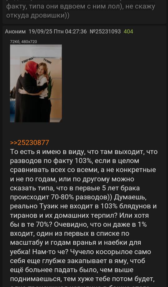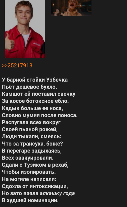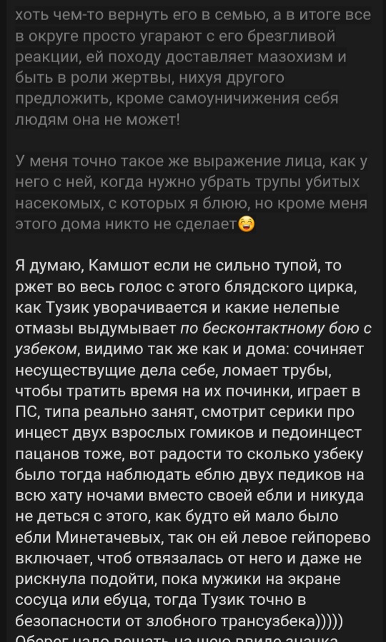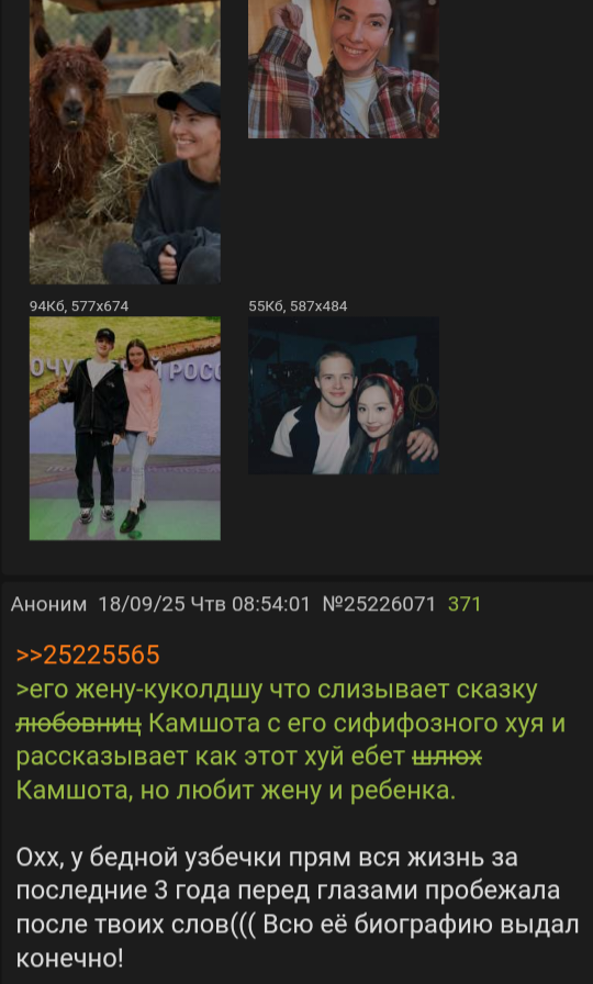 непонятно просто бедобашковые что вцепились метровой хваткой и терпят публичные помои. >>25269966 Аноним 25/09/25 Чтв 09:37:16 № 25269966 60 >>25269793 Ну они обе маргиналки из провинций видимо, такие аля птушницы из сериала Школа, то есть не особо вдумчивые и дальновидные, думают одним днем и одним местом, а точнее низменными инстинктами, как в МЖ главное поскорее залететь от местного альфачазэка или алкаша, лишь бы не одной быть и типа ты всю цель жизни и миссии выполнила, насрав 100500 детей, все эти отсталые бумеры, их родители совковые насаждают им свои интересы и репродуктивное насилие, а если они ещё и не особо умные изначально и без своего мнения и умения парировать этому, то они сдаются и рожают бездумно, типа потом разберусь, а их мужикам тем более пох, не им же рожать и думать о предохранении и сбежать всегда в закат если че можно... У Янкиной амбиции побольше были, она потому и пластику сделала раньше всех, еще до встречи с ним, уже сразу шла с этой целью, даже не думая узнать его получше хотя бы, че зря время терять? Она там ничуть не лучше узбека была на вид😆 Но на узбека там помимо всего прочего еще нация, нравы и религия наложены, как будто муслимы вареником своим тычут рандомному омежке в бане, которого впервые видит, лишь бы опять муж ревновал, а он и не ревнует, пахуям ему, только всех новых знакомых Камшота усердно мониторит, и на весь инет тем более про все грязные трусы выворачивают итд, прочие мерзости что она творит, как Тузик обосрался диареей неделю, фотает его дрочку через штаны и прочее, он уже бедный лицо закрывает от этой вездесущей дуры, которая в очко ему лезет и снимает оттуда отчёты! Любой бы убил уже за такое позорище, а он терпит(( Каловая мб была из токсичной семьи, нам же про неё мало известно, вдруг там все оч плохо и какой-то хрен с горы для нее прям луч света был в этом мире и она и не надеялась на лучшее, потому вцепилась в него мёртвой хваткой? А узбечка тогда ваще полезла к ребёнку, похожему на недоразвитого уошника, который с кучей комплексов и сектанутыми сёстрами и мамашей, ему буквально некуда деться было и защиты искать не в ком, ну никто не обращал на него внимание, на этого зубастого гнома и не повелся бы без причины, а щас он типа краш тиктокерш малолетних, вот что деньги и слава животворящая делает))) Она даже говорила, что влюбилась с 1 взгляда и начала потом добиваться и бегать за ним, ну кому блять это в голову могло прийти такое, особенно тогда, когда он в 5 раз меньше её был и с детским лицом на фоне её проженного рыла Саши грэй? Он на Буратино так органично смотрелся ровесником Виты Корниенко, так сразу и не скажешь кто старше, недаром куколдиху даже спустя пару лет и его оскуфения все равно ещё с его мамкой путают, ибо она оскуфела больше, чем он, как бы он ни старался в этом деле, хотя он даже не следит за собой, а она типа да и все его бабло на это транжирит и все равно все тщетно...