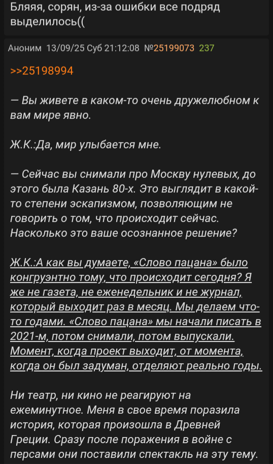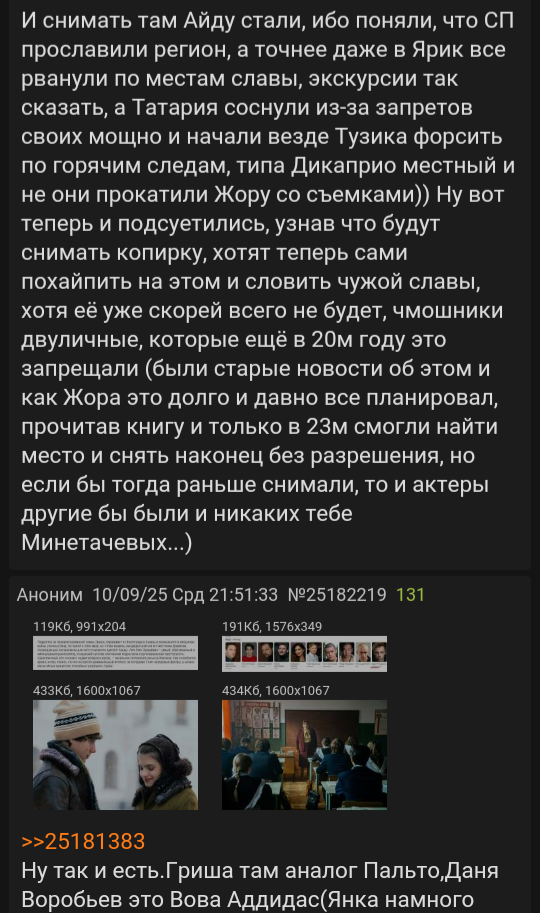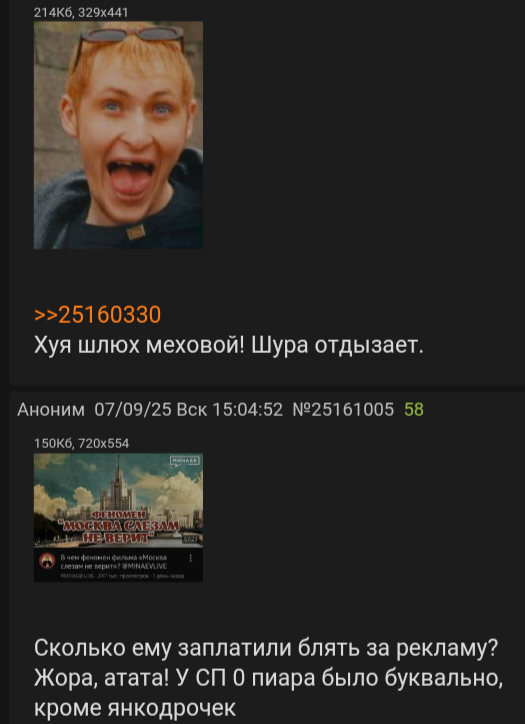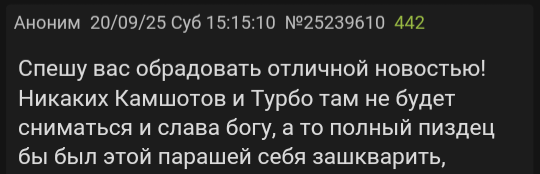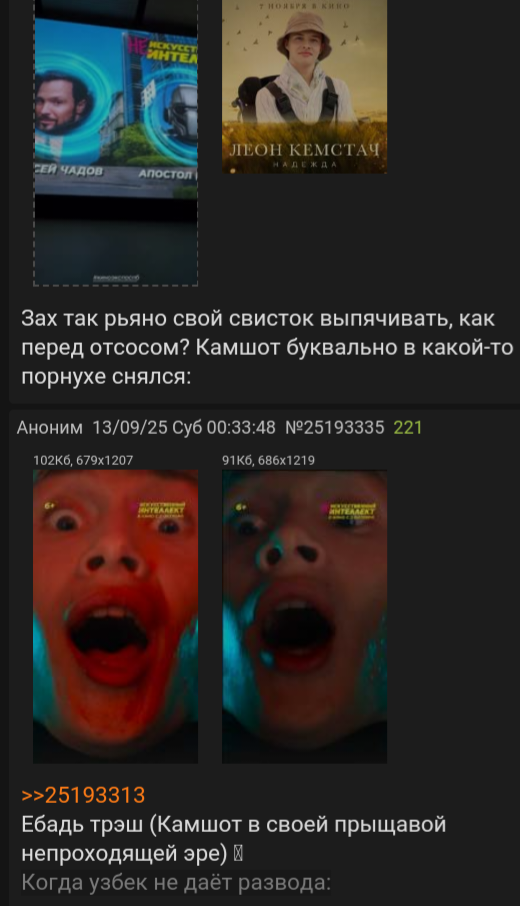 Аноним 27/09/25 Суб 00:54:38 № 25282673 136 С ума ебануца... Оказывается, у СП было 2 варианта: с матом и без! Почему не показали эту версию? Они это типа одновременно снимали по 2 дубля сразу и в дубли с матом актеры больше вкладывались (мой шок теперь в шоке)