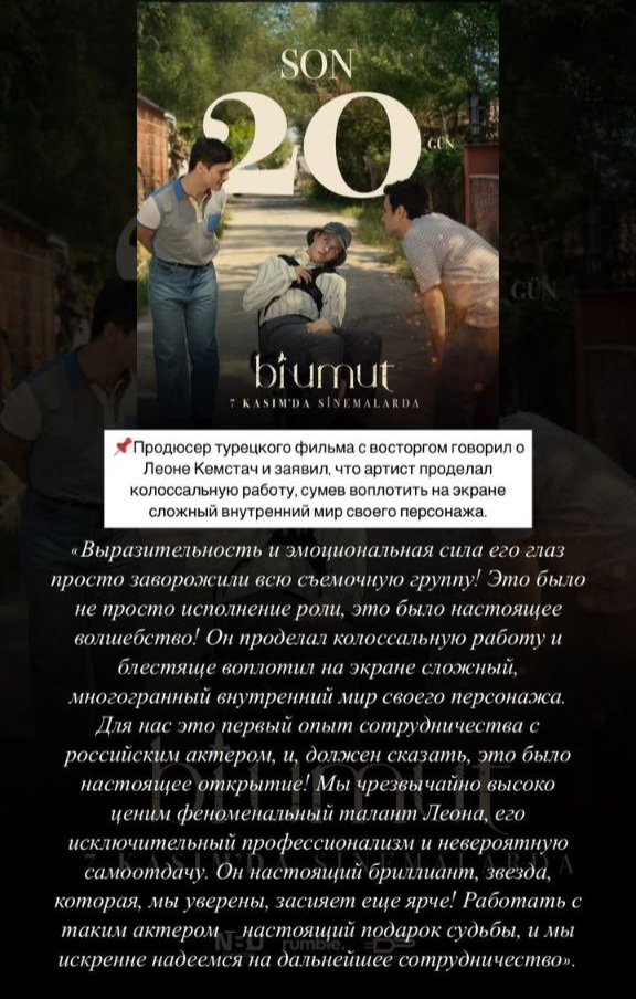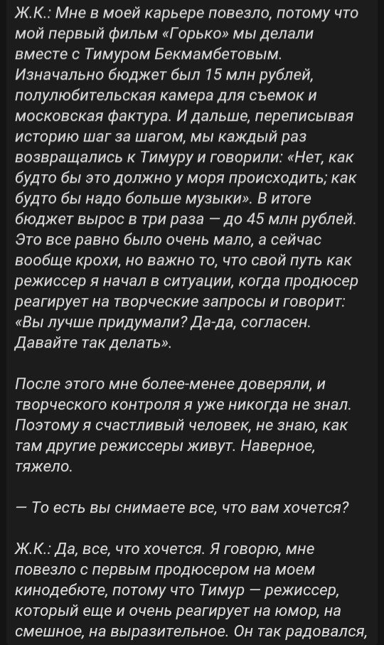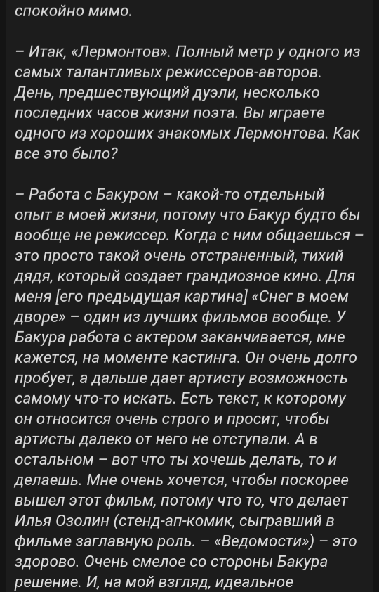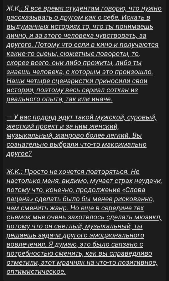 За его спиной — «Текст», «Дама Пик», «Аутсорс», «Слово пацана», «Чемпион мира», «Фишер» — проекты, в которых он неизменно ищет не форму, а подлинный смысл, не эффект, а человеческое присутствие.