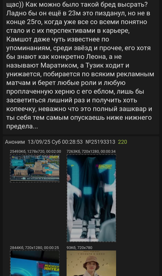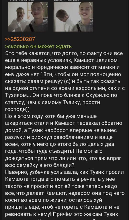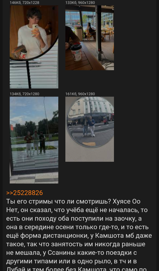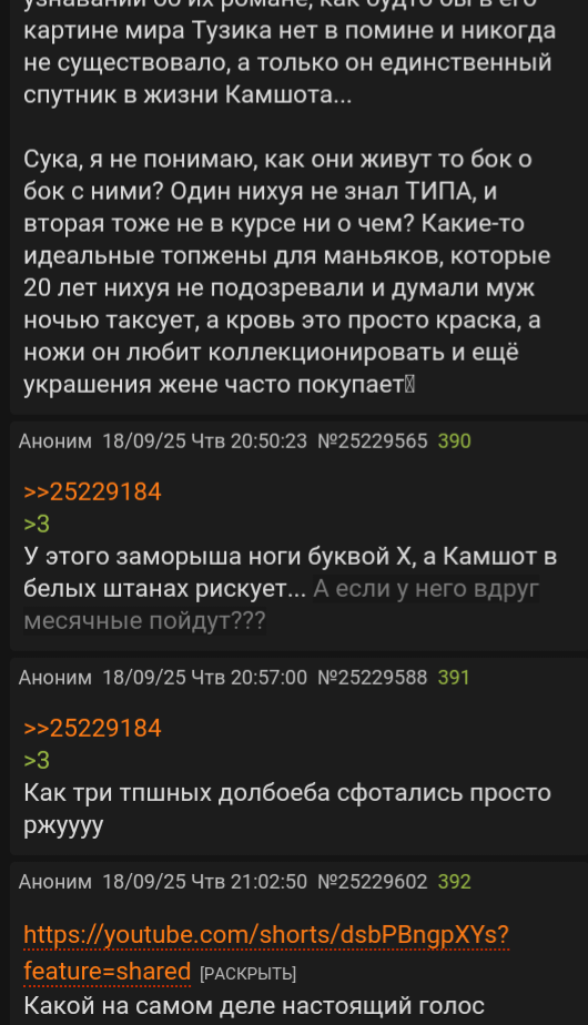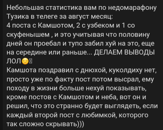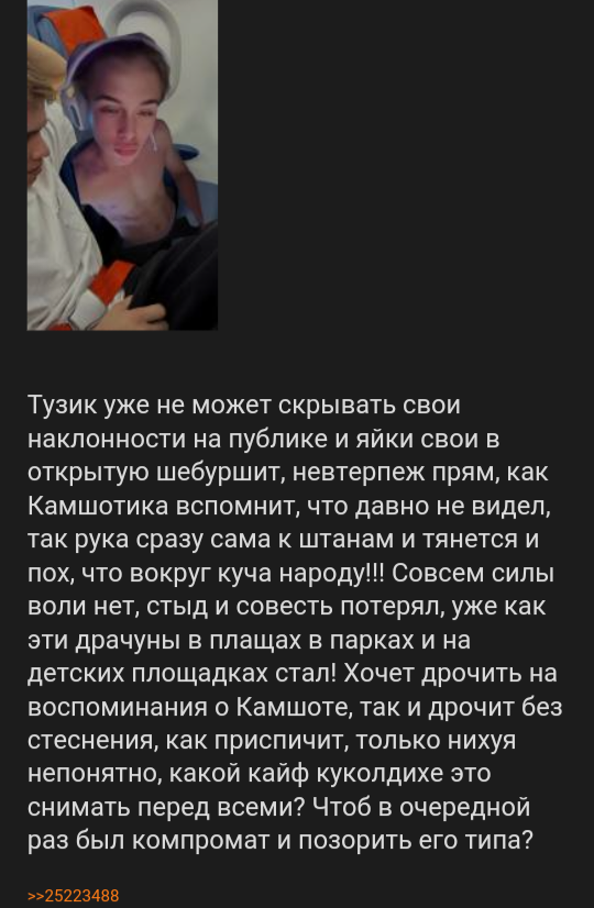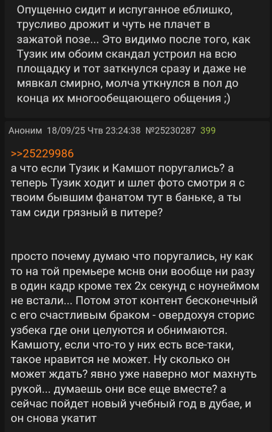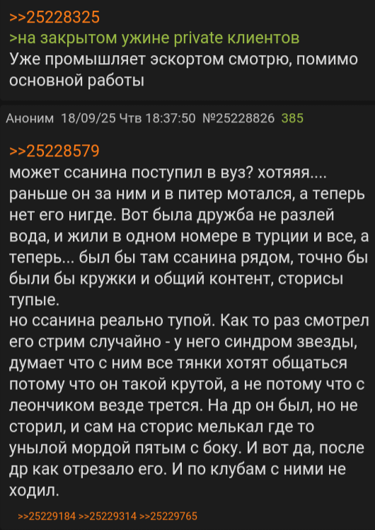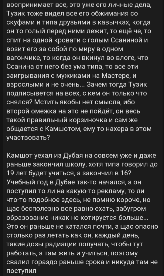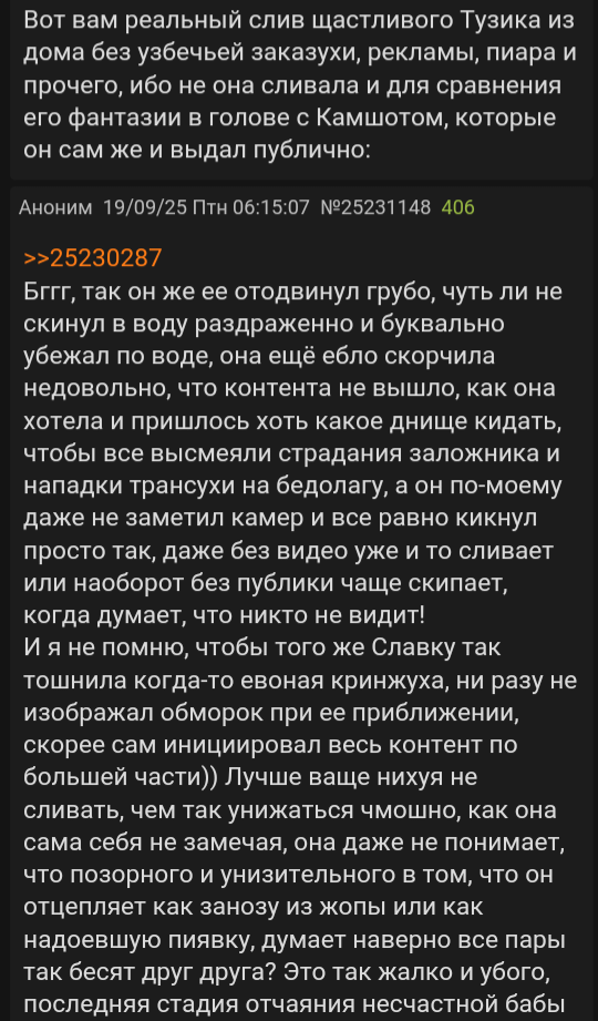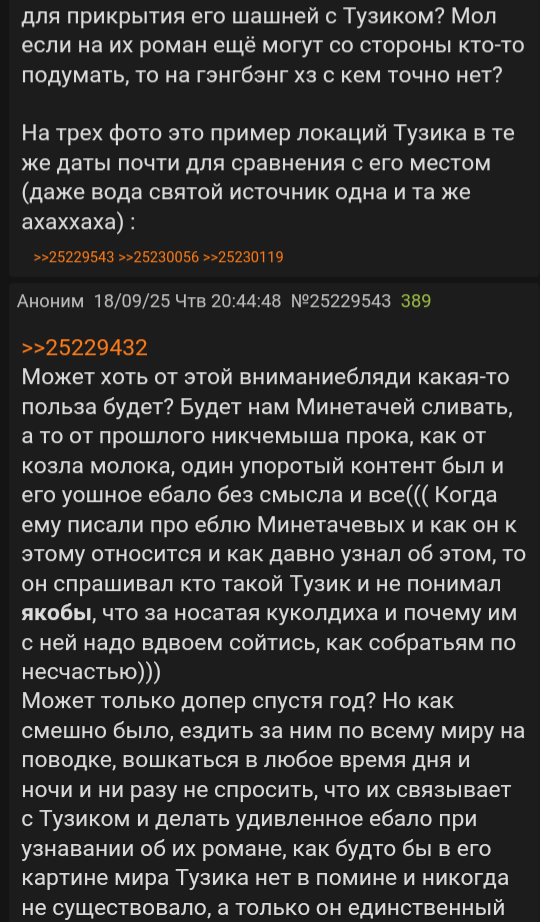Аноним 29/09/25 Пнд 00:17:13 № 25297060 225 >>25296902 Я думаю, Утюг целка, сорян и не летает в Дубаи и если даже и нет, то скорее не из тех, кто станет рисковать и ебстись с незнакомыми, в отличие от безбашенного Камшота, который вечно хуйню вытворяет и всякие необдуманные поступки на эмоциях, типа шарится ночью в лесу и на болоте с ноунеймами... По датам там могли и консервы быть хз, он же путал следы, когда они были с Тузиком вместе, а он сначала ваще про Турцию пиздел всем, хотя был в Африке, а потом уже признался, но точные даты не уточнил и про Дубай ваще молчал, ибо он потом сразу после этого затишья резко в Москве появился, я даже думаю, что они могли прям вместе с Тузиком на одном рейсе прилететь, ибо там разницы почти не было, он на день позже Тузика вышел в эфир, а смысл ему ждать было столько времени хз чего и и пилить рекламу с консервами? Но там его любимчик Чехов нечайно слил, когда они снимали финал и это было прям аккурат перед приездом Камшота в Дубай, не помню то ли 20, то ли 21, ну короче за день до их встречи))) Так что по датам он иногда нарочно пиздеть может и все, что он сам говорит, а не другие люди, не стоит верить, нужно делить на 16! Он даже когда там был в Италии, спецом скрыл точные даты приезда, когда понял, что сам запутался в датах и лучше молчать, так что мог и позже скинуть, вон Тузик же кидал его кружок от имени своего канала и спустя время, там же даты не написаны, он же дб когда-то там поступать в Дубай и доки подавать, а значит он туда точно ездил, а мы с июня такого не видели, то есть он ездил скрытно, возможно прикрываясь другой поездкой или долгим молчанием как всегда, даты в кружках не указаны, так что это не гарантия! Да он в любом случае бесконечно занимается этим пиаром, даже без дат, недавно только Милану Стар зашкварил в своей помойке, все отрицая и любые отношения и что все равно его сердце свободно, а жопа занята Тузиком🤭🤫 Насчёт Турбо ваще бред, че бы его имя не назвать, как у всех? Он че особенный? Ему бы проще было это совсем не постить, как с Тузиком, чем скрывать имя?