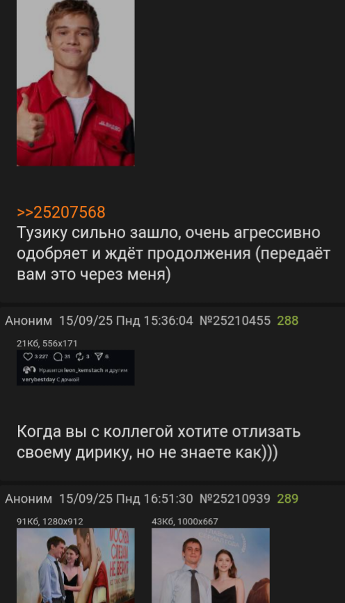 Кто-то должен был это сделать))) Аноним 29/09/25 Пнд 08:05:57 № 25298512 Наконец-то им стали норм комменты писать😁 И кстати Тузик таки поставил лайк любимому на коммент и спецом позже всех, чтоб никто на этом сильно не заострял внимание и не заметили типа, когда уже большинство увидели фотку и забыли про неё лол
