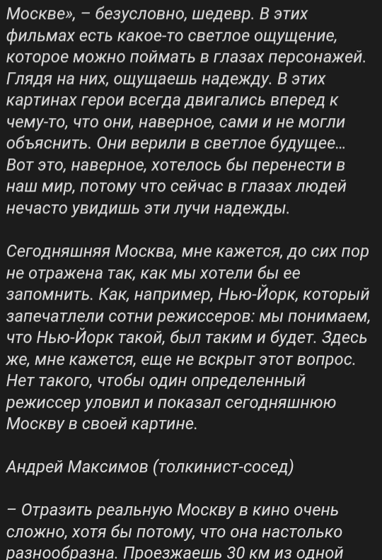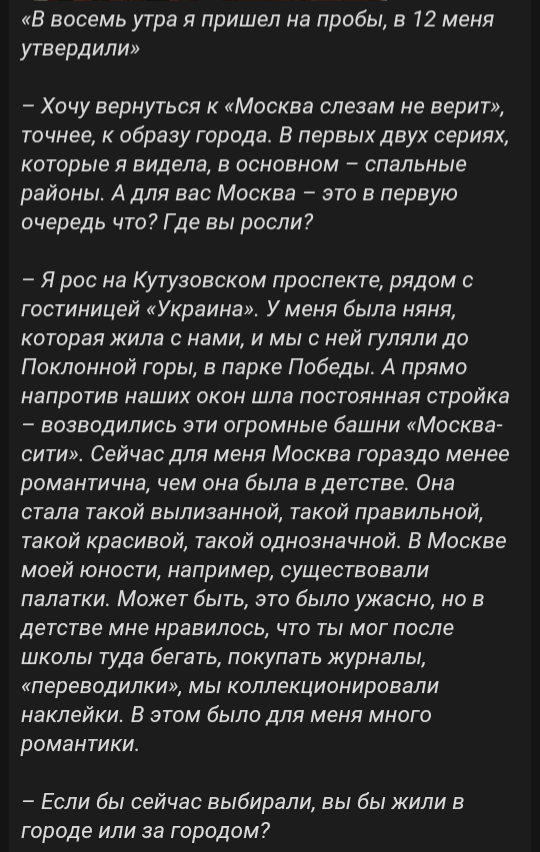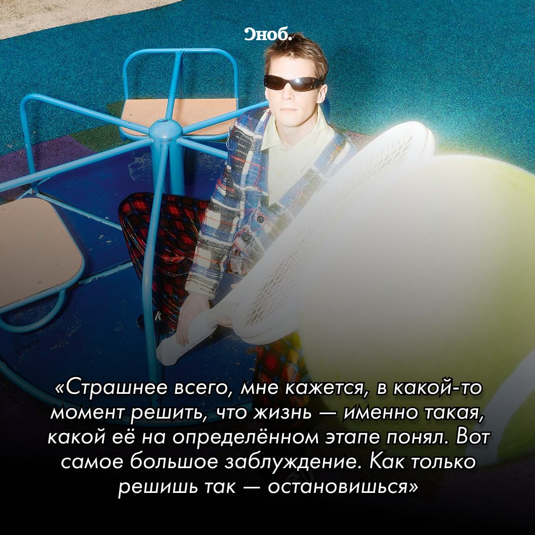 Я ностальгирую о каких-то чувствах, которые я, как взрослый человек, немогу испытать. Отех чувствах, которые тогда дались мне впервые: ощущения влюбленности иразочарования, прогулы школы иинститута, походы вкино вместо уроков, какие-то мальчишеские авантюры. Когда ты становишься старше, ты словно встаешь на какие-то рельсы и думаешь, что тебе понятно, что такое жизнь и чего от нее ожидать. А когда находишься в “бессознательном возрасте”, возрасте порыва, возрасте эмоций и чувств, которые несут тебя вперед, – это самое интересное