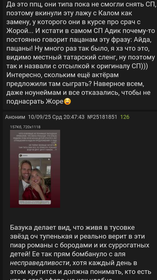 Аноним 27/09/25 Суб 00:43:01 № 25282603 135 >>25282450 Я щас сдохну от ржача))) Ведущий спрашивает у Зули, завидует ли он Минетачевым и их подписоте, ну он сказал, типа у других тоже и так больше, чем у него все равно, но это не суть, пох... Там когда говорили о них, показали вставкой ту самую известную их любовную фотку вместе, как будто бы других фоток у них нет совсем и нельзя было любую вместо этой поставить🤣