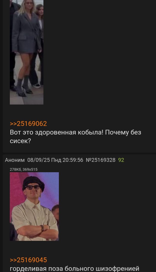 Попался рилс с хуйсосильдью и первый коммент, который там был залайкан: 1) какая страшная... второй: очень не красивая 3) какая-то бабка и колхозница😂😂😂