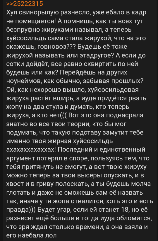 Такое чувство, что эту дичь иуда сливает, чтобы посмотреть на их реакцию... Блять, а что если очевидно, то это сразу не правда что ли??? ЗАЕБИСЬ логика! Типа он поэтому не может поверить в это, что слишком понятно? ААААААА как же сука бесит!!! Что за тупость нах??? Человеку 50 лет, он дважды два элементарно сложить не может и сопоставить по пруфам! Как же у меня горит с жтой непрошибаемости и слепоты или нарочного перевирания фактов и подмены понятий! Зла не хватает сукааа🤬🤢🤮 Как же активно работают его говноагентши конченые, чтоб им гореть в аду, старые носатые лесбухи!