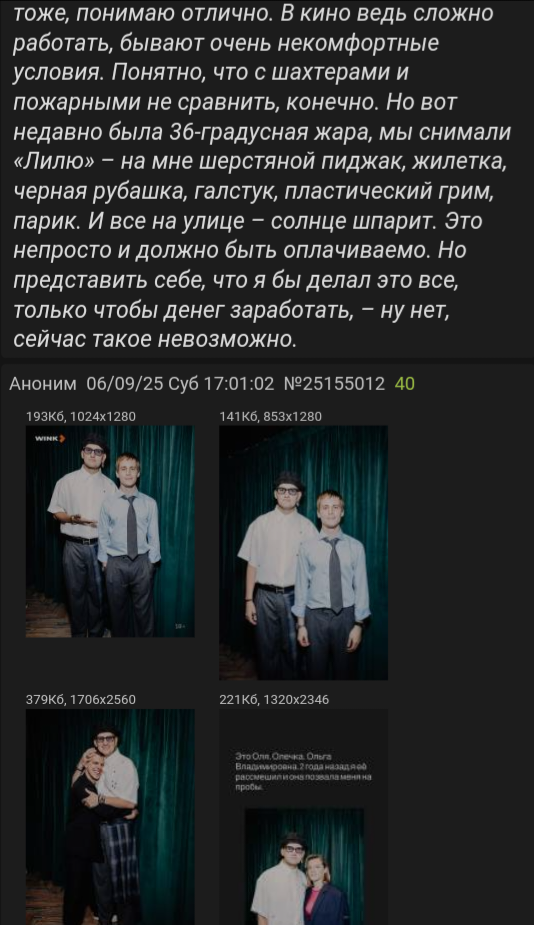 Аноним 25/09/25 Чтв 18:59:20 № 25273206 79 >>25272675 Очередной мискаст из-за хайпа СП,сцены с той бабой походу снимали где Тузик на табурет встаёт а она сутулиться потому что Тузик 165 примерно ну какой нахуй богатырь?С Калом в роли Хоя тоже самое, фанаты группы сгорели с этого и режиссер стал нести хуйню что сняли всего одну сцену чтобы посмотреть на реакцию людей ага а на деле скорее всего уже попили эти бабки и отсняли на коленке.