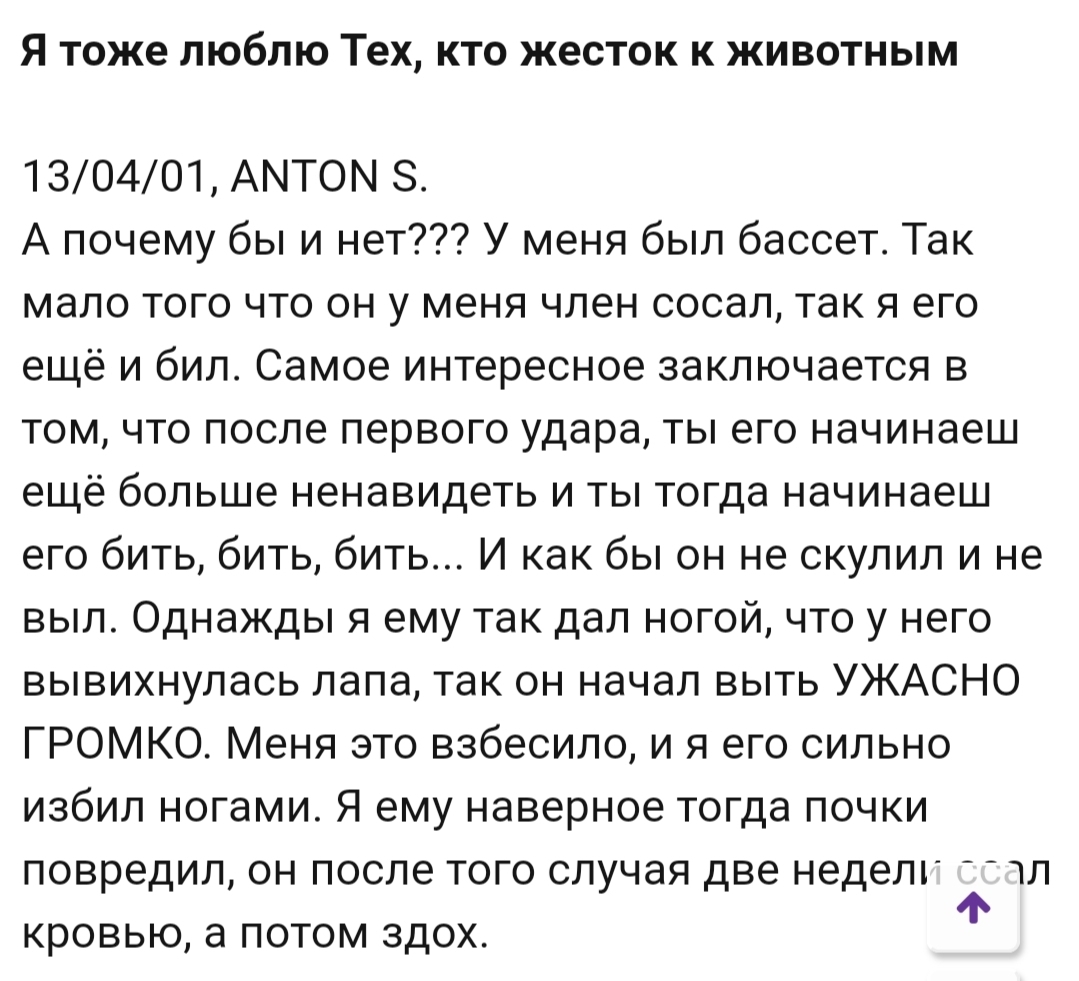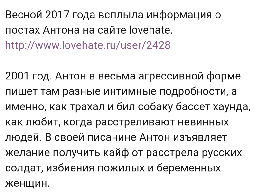 Нет конечно.Анонина имеет целый ряд бед с башкой и это все вскрылось ещё в 17 том году,если кратко то Антонина сидел на сайте Лавхейт(Который ныне не работает) и рассказывал там как ебал и пиздил свою собаку,как он дрочит на расстрелы и расчлененку,как он бы бы ходил по улицам и пиздил рандом старух и т.д. В 2007 году сабж снял короткометражный фильм где его мать и сестра играли проституток,он заставил свою сестру светить голыми сиськами и впоследствии снял как его сестру пиздит и насилует маньяк в лесу.