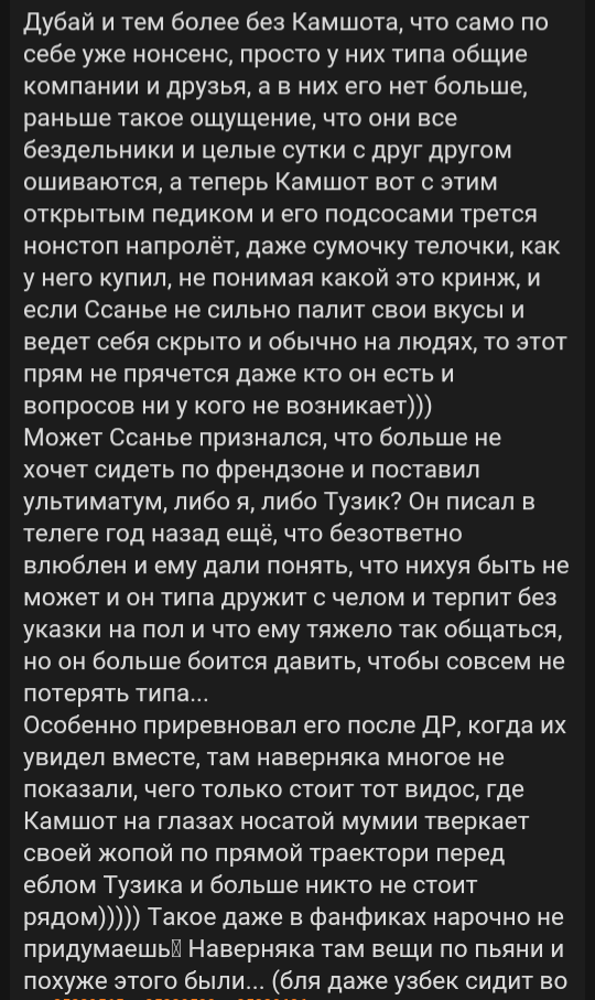 АНОШ, ВСЕМ АБСОЛЮТНО ПОХУЙ НА КАМШОТА, ТЫ ЖИВЁШЬ В СВОЕМ МИРЕ, ГДЕ КОМУ-ТО НЕ ПОХУЙ НА КАМШОТА, НО НИКТО НЕ СНЯЛ ВПОЛНЕ ОТКРЫТЫЕ ПОХОЖДЕНИЯ МИНЕТАЧЕВЫХ ПО ДУБАЮ И ОН САМ УВЕРЕН В ЭТОМ, ЧТО ОН В БЕЗОПАСНОСТИ, ПОЭТОМУ ЗОВЕТ ПИАРЩИКОВ НА ПОМОЩЬ В ТАКИХ СЛУЧАЯХ, ВЕДЬ ОН ЗНАЕТ, ЧТО НИКТО НЕ ЗАСНИМЕТ И ОН ЗРЯ ЖОПУ РВАТЬ БУДЕТ С ПОДСТАВНОЙ КОНТРАКТНИЦЕЙ И ПОЭТОМУ МОЖЕТ С ТУЗИКОМ СВОБОДНО ГУЛЯТЬ ПОЧТИ ВЕЗДЕ, И КАК ИХ ДАЖЕ В МАЕ 24ГО, КАК ОН СКРЫТНО ПРИЕХАЛ И ОНИ КУДА-ТО ХОДИЛИ, НО ТАК И НЕ СЛИЛИ ЭТОГО И НИКТО ДРУГОЙ КОНЕЧНО ЖЕ НЕ СЛИЛ ТОЖЕ! Ну ладно допустим в этом году до них дела не было, но в марте 24го они же были на пике и их тоже никто не снял, как они с Камшотом в кафе сидели после ночевки хз где вдвоем, что аж пришлось снимать самим, бедолагам и удалять потом🤭