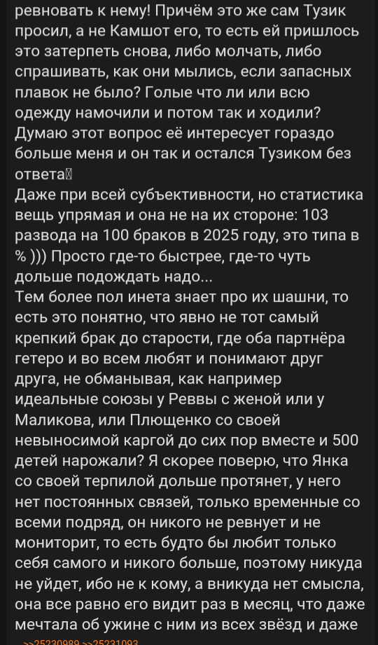 Если Тузик в 23м году ещё поначалу что-то пытался играть там в семью, то последнее время его будто все это уже вконец заебало и он даже не старается изображать интерес к браку и к ней в том числе, воспринимает эту ношу как вторую свою работу типа 24/7... Похоже, он сам и будет инициатором развода, когда прям вкрай выгорит и устанет, а не проклятый узбек, как мы раньше думали, ибо она все давно знает и терпит и дальше будет, пока все не узнают и то не факт, а у него из-за нехватки бабла и вездесущности в каждой бочке затычке и градус активности спал, значит и наличие брака уже само по сути бесполезно и выгоднее публично быть одному, чем тащить этот чемодан без ручки! Уже такие вещи стал прямо говорить при всех на всю страну, что они с ней просто друзья и не ебуца даже и что в норме ебля на стороне как раз таки, но у него такого точно нет, ведь он в меньшей степени нетрадиционной ориентации (с) ))))) И при ней озвучивать свои хотелки насчет Камшота (она то явно его кружки палила, может даже взбучку устроила потом, а он съехал с этой темы, якобы шутка, сто пудов)