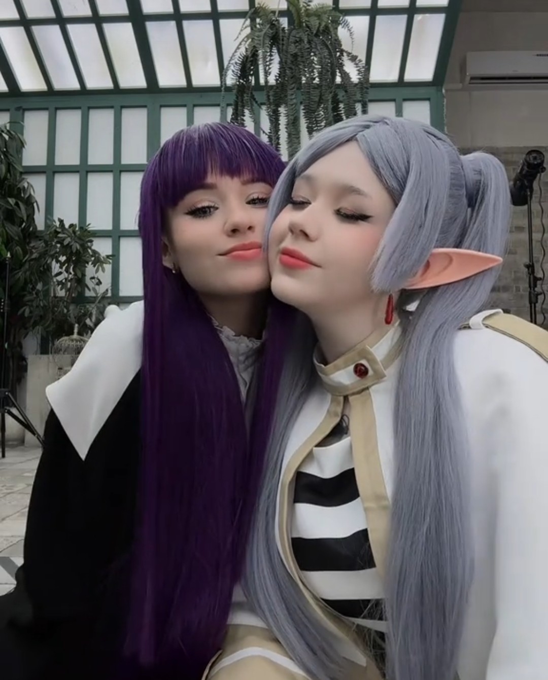 >>25456471 Two beautiful girls with black hair completely take off their outerwear and underneath they have sexy underwear, stockings, thongs, and lace bras. The left girl has large female breasts, and the right girl has small female breasts. The girls start kissing using their tongues. They touch each other and lick each other's lips. At the end of the video they look at the viewer.