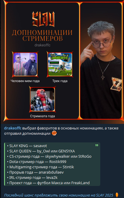кто-то реально думает что коровка не заберёт второй год, когда в прошлом в полном остракизме от всех стримеров твича и меньшей популярности в одиночку забрала статуэтку, а щас ещё сильнее набрав популярность и заимев медийно успешного парня и компанию друзей на твиче проиграет генсухе которая не стримила весь год и единственное событие которое она сделала это спалила жопу в бане. смешно