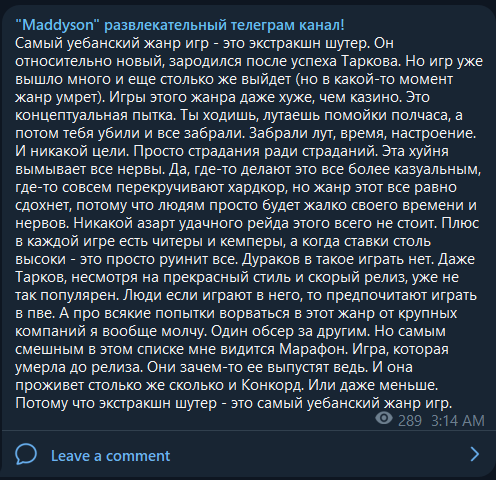 Самый уебанский жанр игр - это экстракшн шутер. Он относительно новый, зародился после успеха Таркова. Но игр уже вышло много и еще столько же выйдет (но в какой-то момент жанр умрет). Игры этого жанра даже хуже, чем казино. Это концептуальная пытка. Ты ходишь, лутаешь помойки полчаса, а потом тебя убили и все забрали. Забрали лут, время, настроение. И никакой цели. Просто страдания ради страданий. Эта хуйня вымывает все нервы. Да, где-то делают это все более казуальным, где-то совсем перекручивают хардкор, но жанр этот все равно сдохнет, потому что людям просто будет жалко своего времени и нервов. Никакой азарт удачного рейда этого всего не стоит. Плюс в каждой игре есть читеры и кемперы, а когда ставки столь высоки - это просто руинит все. Дураков в такое играть нет. Даже Тарков, несмотря на прекрасный стиль и скорый релиз, уже не так популярен. Люди если играют в него, то предпочитают играть в пве. А про всякие попытки ворваться в этот жанр от крупных компаний я вообще молчу. Один обсер за другим. Но самым смешным в этом списке мне видится Марафон. Игра, которая умерла до релиза. Они зачем-то ее выпустят ведь. И она проживет столько же сколько и Конкорд. Или даже меньше. Потому что экстракшн шутер - это самый уебанский жанр игр.