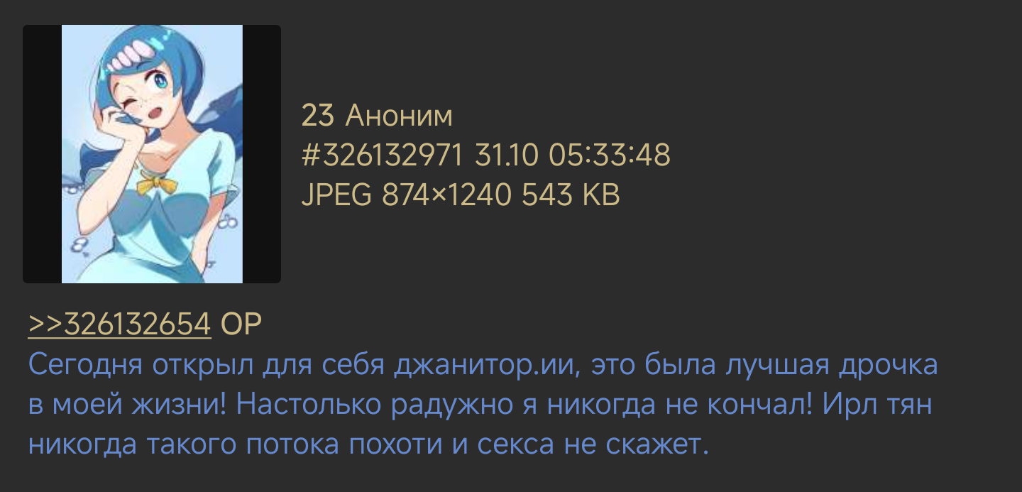 >>25486685 Да там нет пруфов, что этот огр с треда, хз почему караси так заклевали на эту пикчу или один шиз чос поимитировал просто. Тут всегда были шизоиды, которые тащили всякий кал из /б и соседних тредов, может это оттуда.