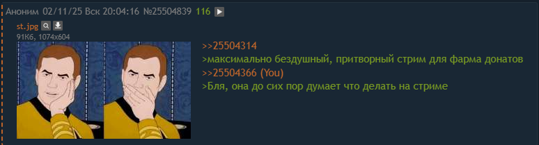 >>25500944 Зеня следит за чмодьем по привычке и его нытье очевидно влияет на её настроение, это заметно