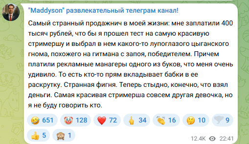 >>25513713 Нулевая:ведь чмодьё известный меценат, помогающий медианищим стримерам с онлайном в тридцать человек. Да и постоянный форс в одной и той же сетке тг‑каналов с самопальными мемами, которые вызывают только недоумение, тоже случайность. Нужно понимать, что Дюся Хламидов известный блогер и набрал себе огромную аудиторию, когда была попытка стать бэдкомедианом от мира белорецкой телекомпании, там были миллионы просмотров.
