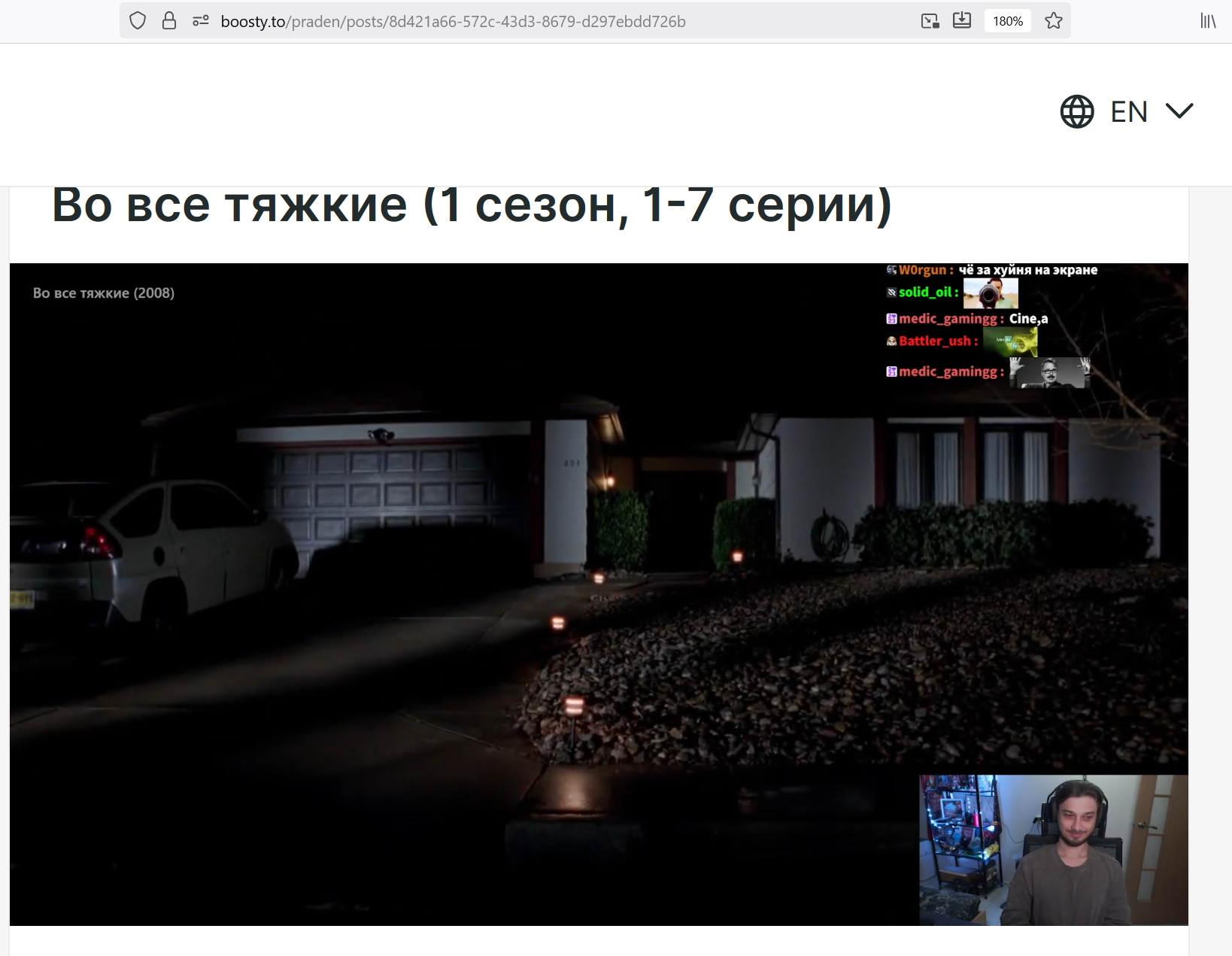 >>25502242 писать все равно толку нет, чат слишком быстрый из-за юзевских срунов чат на экране есть если что а вообще я просто фоном врубил, я уже 4 раза пересматривал бб в разных озвучках и в оригинале