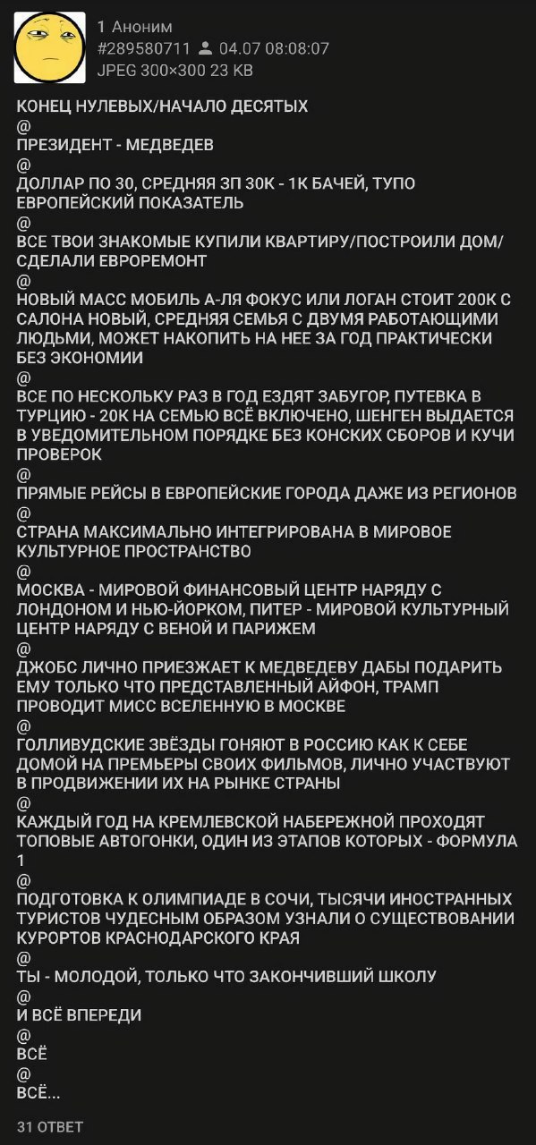 >>25513633 В 90-е не было хорошо. Либо ты столичный либо маленький тогда был совсем, либо еще не родился. Все описанные плюшки пошли с середины нулевых, квартиры, зарубеж, тогда да, жить стали ощутимо лучше.