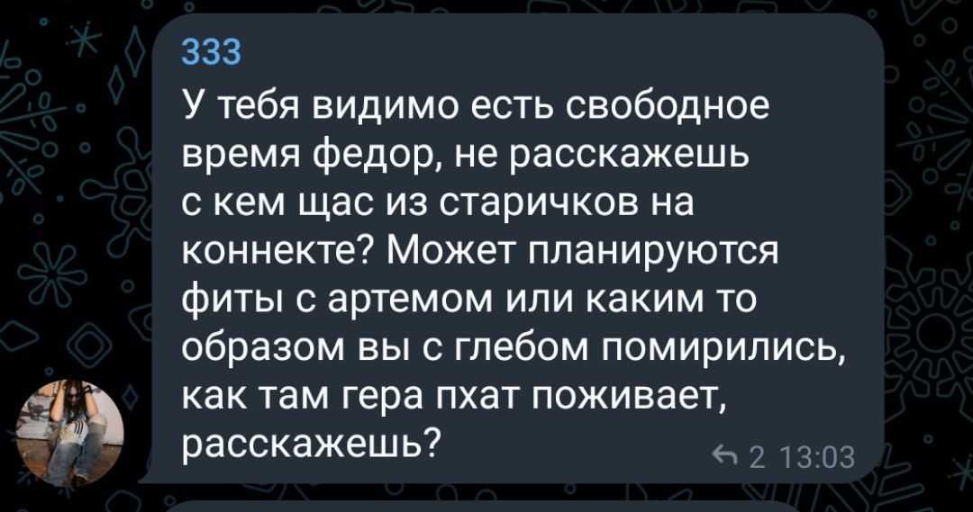 Я таких видел десятки: всегда те же признаки - неясные источники дохода (“живёт в Пивососисочной Бюрократоублюдии, но без концертов”), чересчур активное участие в чужих делах (“всегда готов помочь, но никогда непонятно, чем живёт”), дружба с нужными людьми и эффектный либеральный фасад. Это ровно то, как делаются внедрения в культурную среду: создать вокруг себя ауру «своего», смешного, чуть безобидного - а потом начать узнавать, кто с кем общается, кто куда донатит, смоллтоки с Певчих и с Нойзом в закулисье либерашьих концертов.