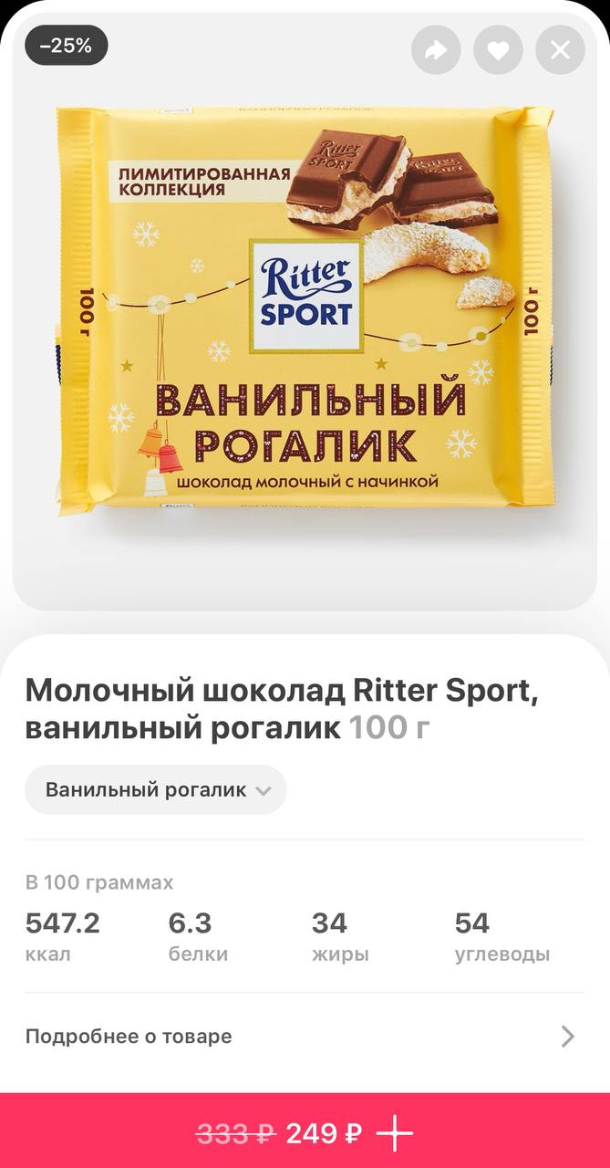 Новогодние Ritter Sport со вкусом ванильного рогалика и имбирного печенья завезли в Самокат. Дегустаторы называют новинки насыщенными, а ванильный рогалик — одним из лучших вкусов бренда. Цена — 249 рублей.