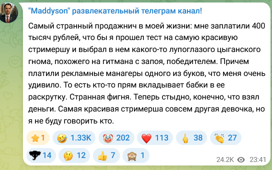 Самый странный продажнич в моей жизни: мне заплатили 400 тысяч рублей, что бы я прошел тест на самую красивую стримершу и выбрал в нем какого-то лупоглазого цыганского гнома, похожего на гитмана с запоя, победителем. Причем платили рекламные манагеры одного из буков, что меня очень удивило. То есть кто-то прям вкладывает бабки в ее раскрутку. Странная фигня. Теперь стыдно, конечно, что взял деньги. Самая красивая стримерша совсем другая девочка, но я не буду говорить кто.