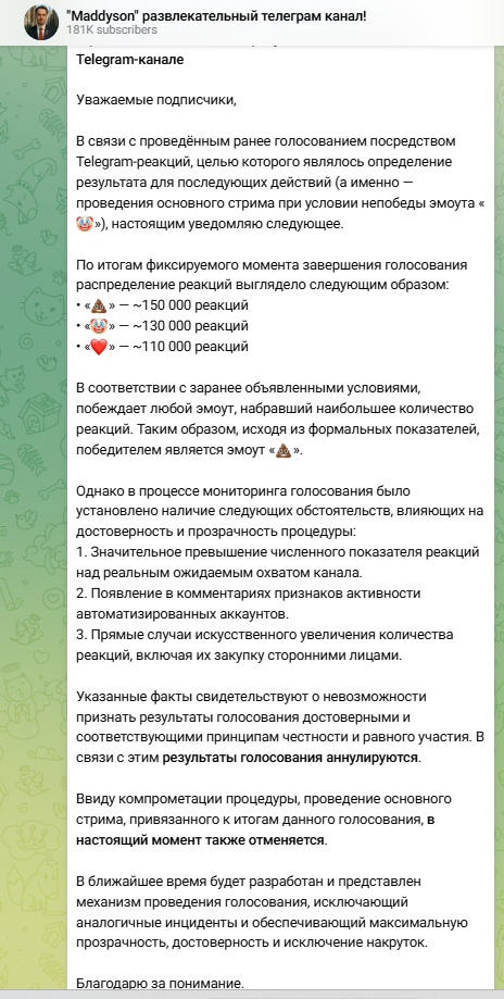 Однако в процессе мониторинга голосования было установлено наличие следующих обстоятельств, влияющих на достоверность и прозрачность процедуры: 1. Значительное превышение численного показателя реакций над реальным ожидаемым охватом канала. 2. Появление в комментариях признаков активности автоматизированных аккаунтов. 3. Прямые случаи искусственного увеличения количества реакций, включая их закупку сторонними лицами.