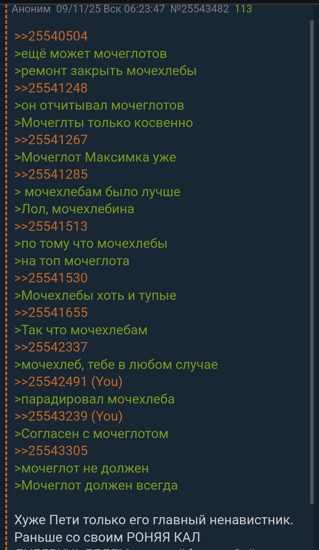 Если Петя умом не блещет, но хейтерок его и вовсе одноклеточный. Вижу в нём малолетнего преданного фаната, которого Петя когда-то забанил за тупость. И теперь он мстит, в силу скудного умишки, строча по кругу одинаковую залупу, которая кажется ему обидной и очень остроумной.