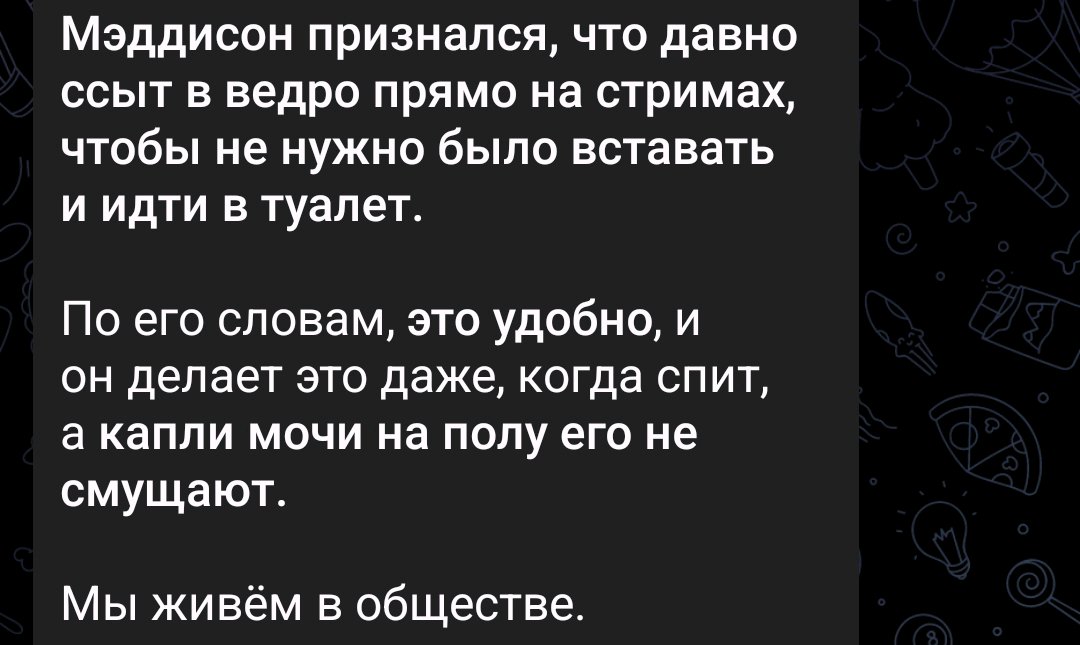 бля чёт орнул, то что он пьет газировку на стримах для тебя значит что они живут в изобилии? что за шиза такая, ахахахах. а если он жрать бургеры начнет на стримах, то ты наверное будешь думать что он уже в списке форбс, я правильно понимаю?