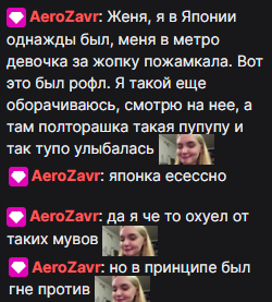 https://www.twitch.tv/videos/2563800917?t=4h02m30s - просматривая старье, наткнулся на 10 минутное бомбление на Японию, что уже не раз обсуждали тут с неизменным успехом, начинается "съездила бы куда-нибудь, главное не Япония, Япония уже затрахала, этот менталитет, какие-то закрытые омежки, все какие-то пластиковые люди, роботы...", по ходу рассказа выясняется, что денег зря проебала, они кроважадные твари, мечтающие опыты над китайцами проводить, интернета нету, музеи ниче так, но под Москвой в десятки раз лучше и бесплатно, а из Акибы делают какого-то мученика, когда он на самом деле сталкер с неудавшимся браком, который хотел поменять свою жизнь за её счет