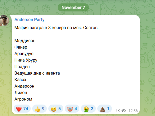 >>25538031 я бы на его месте сделал такой прикол начинается мафия без него, все люди играют первую партию потом вторая партия - город засыпает и когда все проснулись хуяк среди всех появляется мэд внезапно вот это было бы ахуй