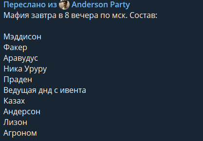 Уже через час будет мафия с двумя братьями Ильей Мэдом и Женьком Эрроу. Также будет Дёмкин Факер Иван, которого Илья Мэд будет мастерски и тоненько подъебывать. Ух, бля! Вы готовы? Взяли газявы и чипсеков? Следующие 6 часов пройдут охуенно.
