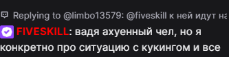 смешно что носатый по итогу проиграл полемику вместе со сворой своих тридцатилетних поданных которые шутили и дизморалили одну танкующую пиздючку 20y.o. и она привела к тому что он капризный ребёнок который отменил всё из-за шизы в башке, тут побелке респект, несмотря на зажатость смогла в соло задефаться, пускай теперь ищет новую компанию, в ласт раз инактива с фриками вроде с кишками играла во всякую поеботу, думаю и щас сможет