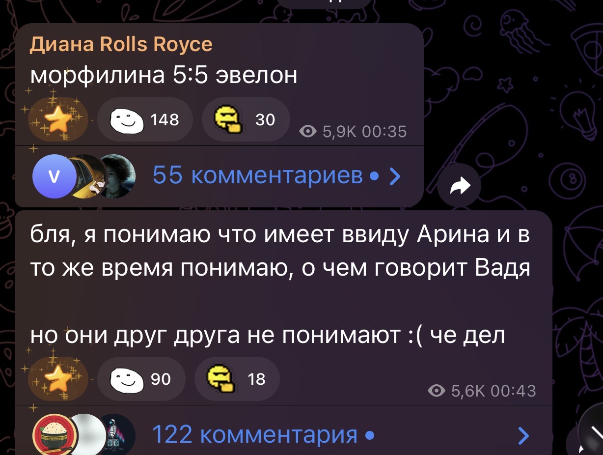 >>25555367 морфилина запустила стрим, начала говорить, что некомфортно было в той компании, носатый и киевстонер душили шутками тупыми. В ее чат ворвался носатый, начал писать, что он с ней уже обсуждал эту тему 4 часа в личке и не стоит на стрим выносить еще раз. Клип скинули мокрице, мокрица предложил все решить на стриме. Дальше я заснул